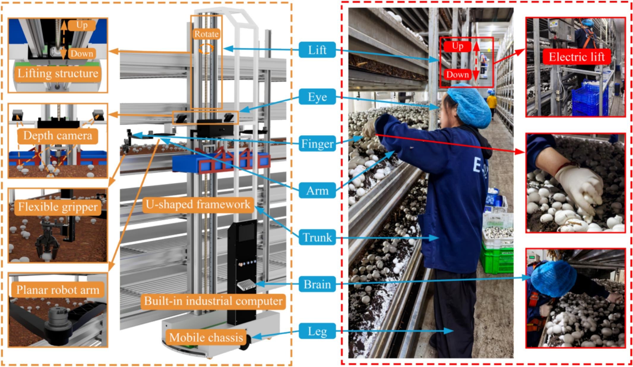 在双孢菇栽培中,工厂采用恒温恒湿环境与机械化生产设备,旨在实现四季高效生产与供应。然而,采摘环节仍高度依赖人工操作,严重制约产业发展与企业效益提升。为此,开发自动化蘑菇采摘装备迫在眉睫。本文受人工采菇动作启发,系统研究并研制了一款仿生蘑菇采摘机器人。